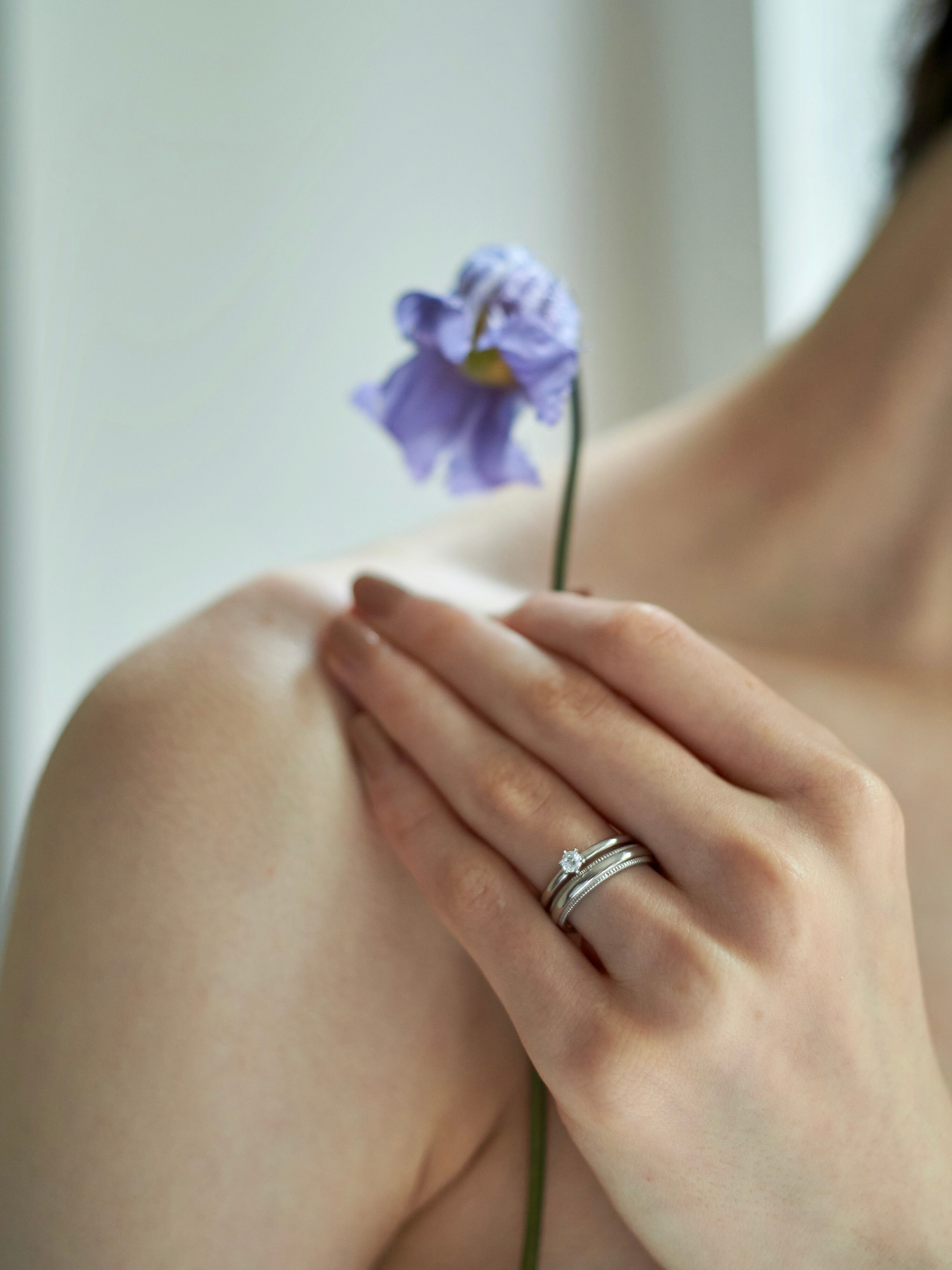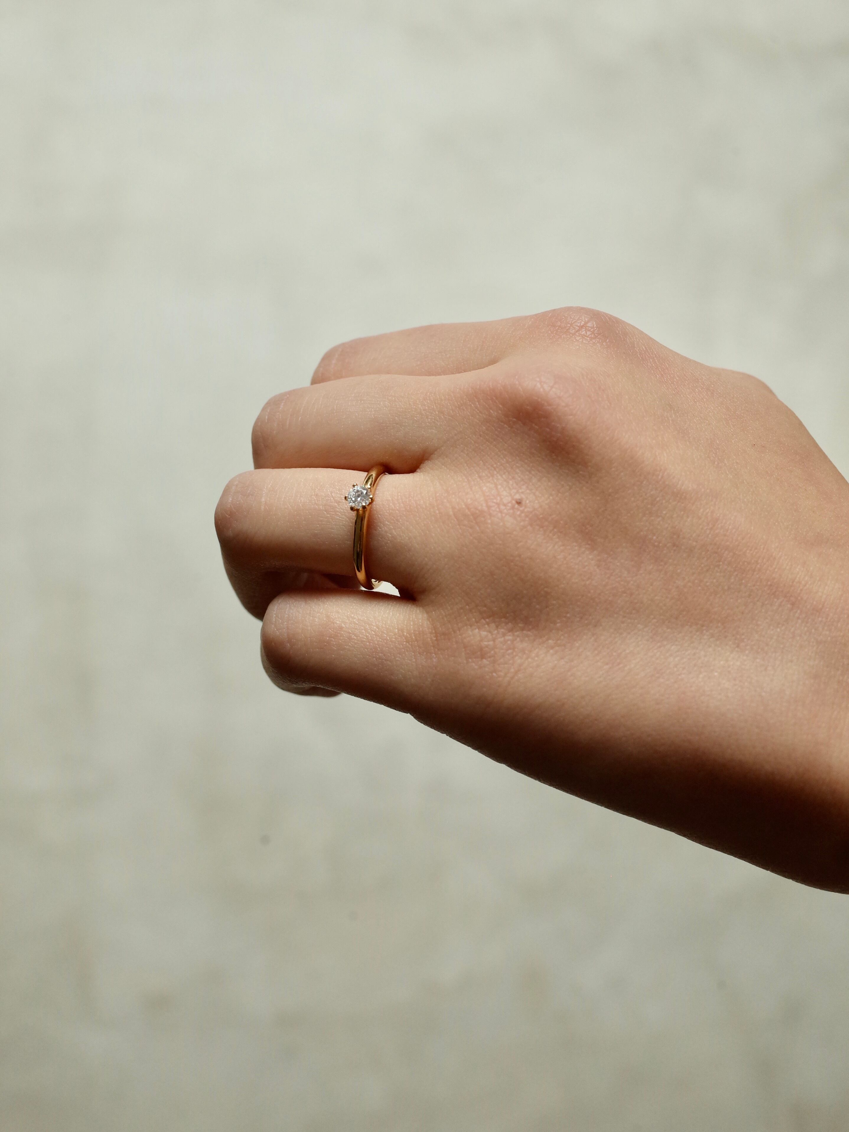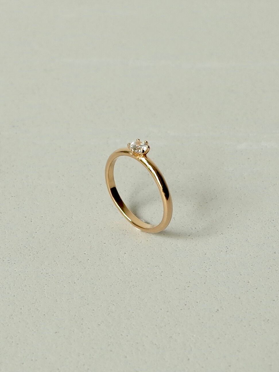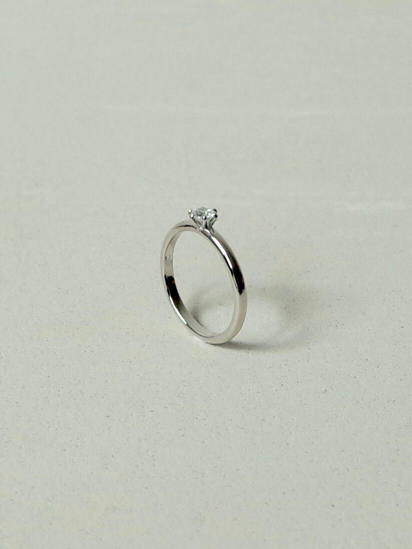 シンプルなフォルムに凛としたダイヤモンドが輝くリング。細身に仕上げているので着け心地も印象も軽やかで、他のリングとの相性も良いです。