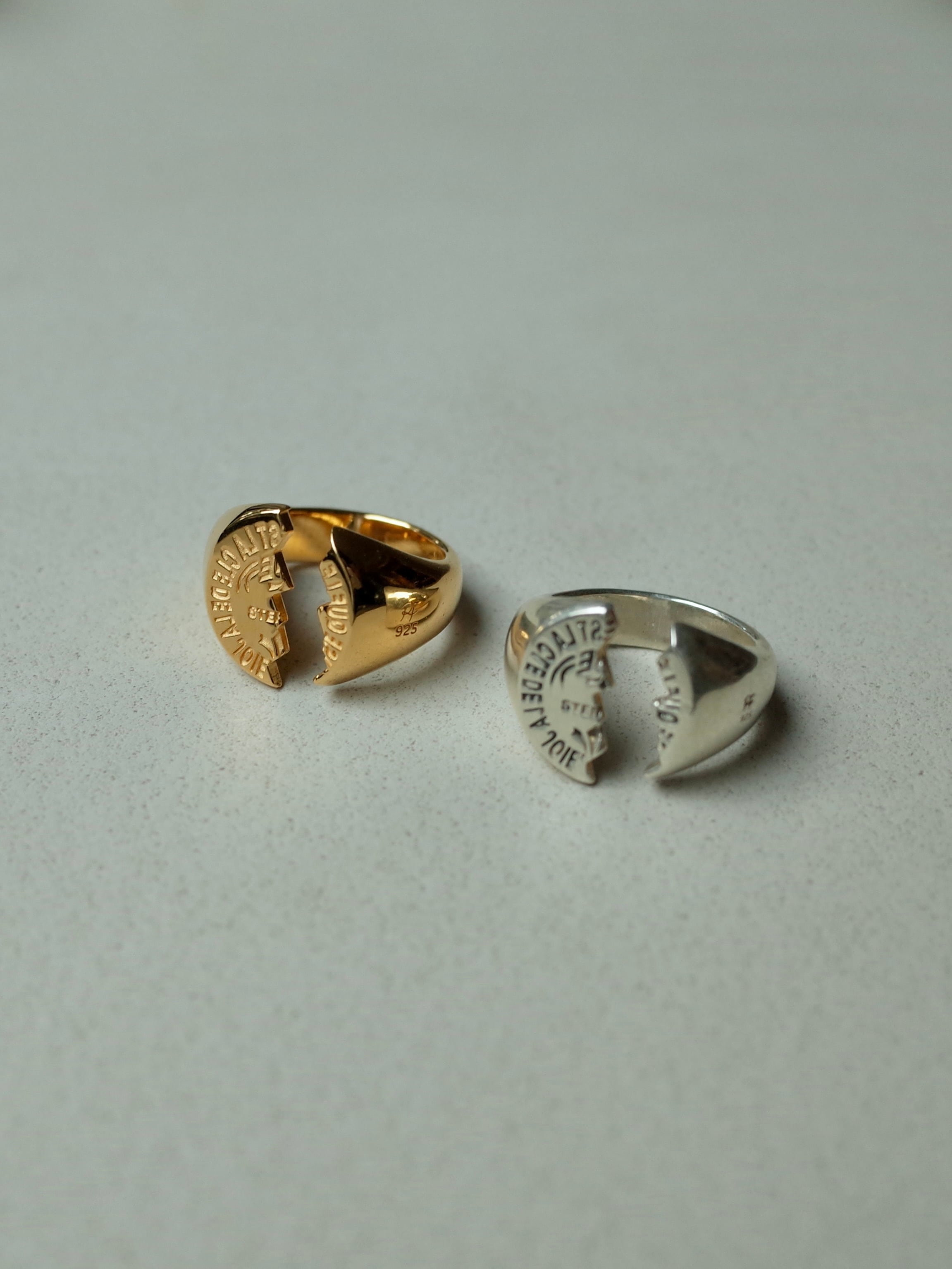 印台部分を大胆に割ったデザインが特徴的なシグネットリング。